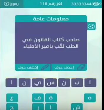 صاحب كتاب القانون في الطب لقب بأمير الاطباء لعبة وصلة