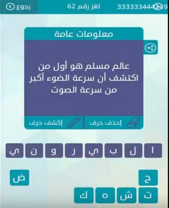 اجابة سؤال عالم مسلم هو اول من اكتشف ان سرعة الضوء اكبر من سرعة الصوت من لعبة وصلة للمجموعة السا صقور الإبدآع